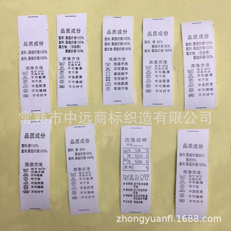 现货2.5CM成份标 水洗标 洗唛,品种多 质量好 每卷2500个 ,特殊成分 特殊款式可定做 ,欢迎广大客户前来采购 !联系电话:0512-52754119(葛小姐)