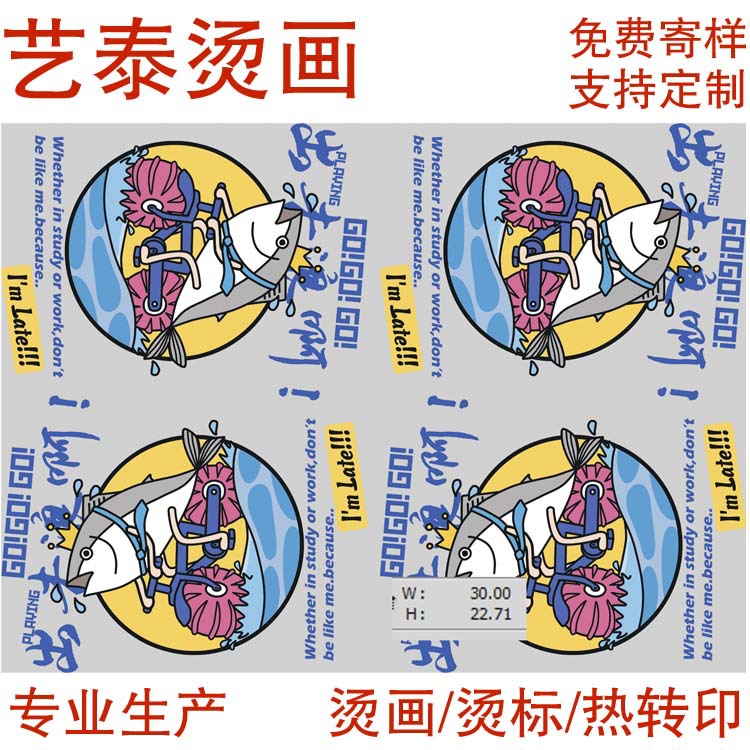 义乌市艺泰烫画厂,是一家生产、销售、研发为一体的专业烫画、热转印纸民营企业。经过多年的发展,公司拥有现代化生产设备和雄厚的技术力量,专业化的设计团队,规范化的企业管理,良好的信誉赢得了国内外客户的信任和肯定。 本厂主要生产普通低温烫画、高弹耐水洗烫画、高品质环保烫画、热固高温发泡烫画、金/银葱烫画、夜光烫画、反光烫画、高亮/哑面烫画、冷撕系列烫画、高弹洗水唛、泳装烫画、,植绒烫画、升华转印烫画、玻璃珠烫画等。日产烫画30000张以上,出货及时,质量保障,量大从优。
