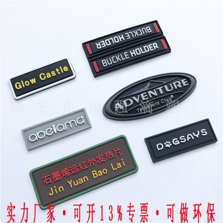 专业生产PVC滴塑商标微量射出商标和硅胶制品。滴塑商标产品种类有:拉头片、手表带、茶杯垫和各式吊牌、鞋类边节、鞋舌、后套和成衣、手袋、帽类等。