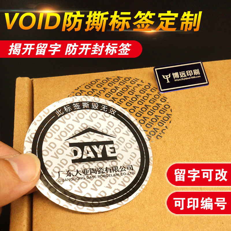 我们博远印刷定做的揭开留字VOID防伪标签,贴在牛皮纸箱、包装盒、PP胶袋、塑料件、还是五金机械件上,都能达到留字的防伪效果;此具有防拆封、防盗用、防私换的标签,能广泛应用到各行各业的防拆封包装解决方案中。
