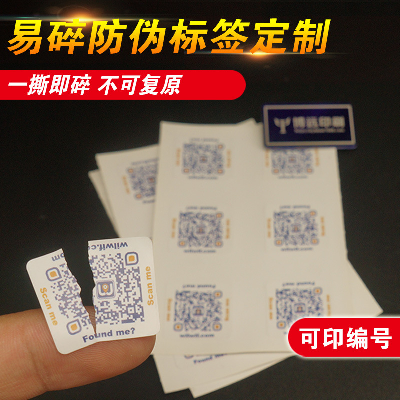 在易碎不干胶上还可以印刷带防伪的二维码或编码,以增加其防伪性,让易碎纸标签变成即具有防开封又有防伪功能的多功能防伪封口贴纸。博远印刷还可以为客户提供可变号码技术的印刷,能满足更多客户的需求。