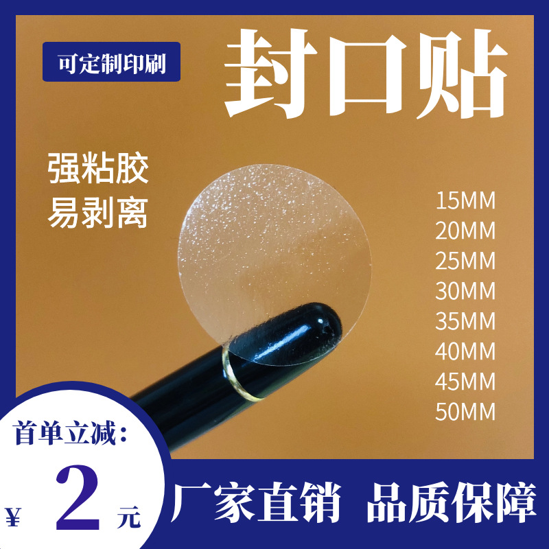 封口贴纸外卖包装防水标签定 做透明不干胶pet圆形透明封口贴