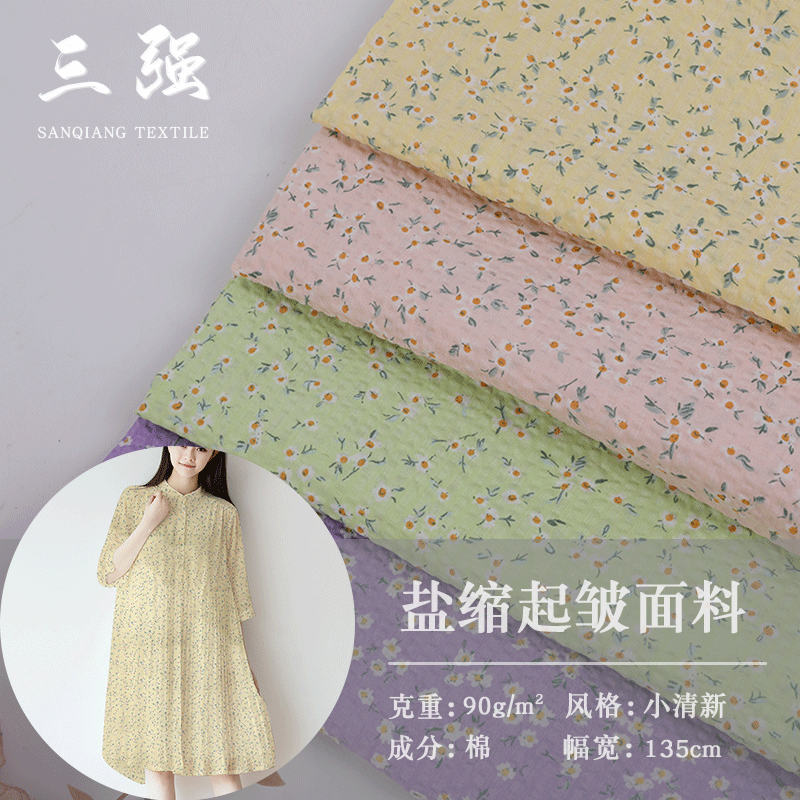 现货 全棉印花面料 盐缩起皱布料 春夏碎花泡泡时装连衣裙棉布料
