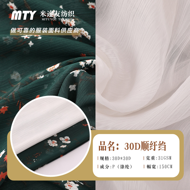 现货30D顺纡绉雪纺炼白布料短裙汉服连衣裙涤纶印花褶顺纡绉面料