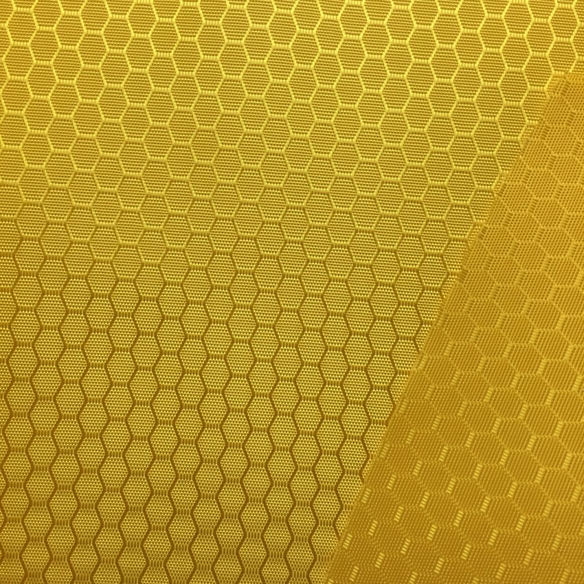 该面料经纬丝都采用涤纶DTY300D丝,选用粗点变化透空组织在喷水龙头织机上交织而成。织物经松弛精练、预定型、碱减量、柔软定型后,面料反面再经橡塑涤层。其织纹细腻、光泽柔和、防水性好,以此产品制作的箱包是扮靓女士所追求时尚新潮的宠物。其面料门幅150cm。
