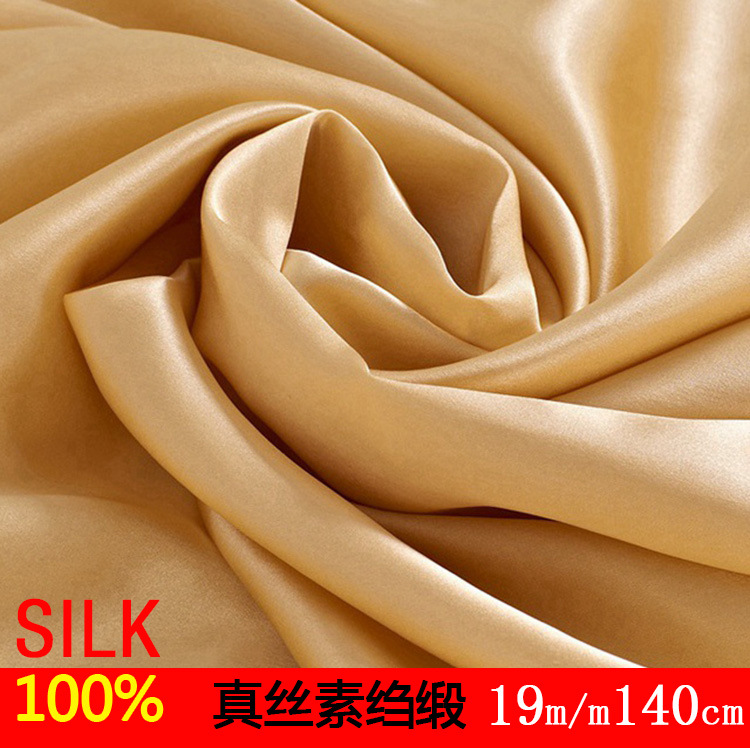 真丝素绉缎是真丝面料里比较常规的面料之一。真丝素绉缎织法紧密,手感细腻柔软,有正反面,正面光滑细腻,光泽自然, 面料显得高贵典雅。面料反面是亚光的,有着直线纹理的绉面。