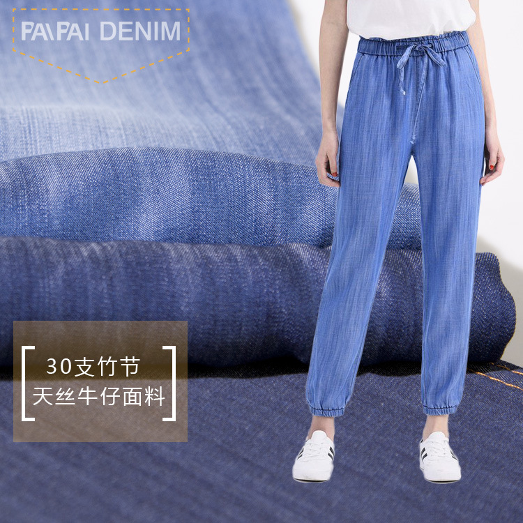 - 产品优势:30支竹节纯天丝牛仔面料,保留了牛仔的风格味道,又增加了天丝的垂感丝滑,清爽,舒适,透气。是春夏季童装,女装,连衣裤,连体裤,阔褪裤首先面料。同提供40支,32支,30支,21支,16支纯斜纹,横坚双向竹节天丝面料。