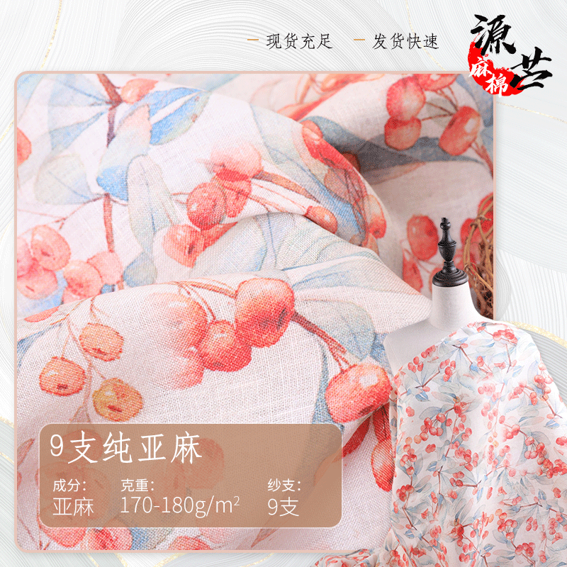现货供应纯亚麻 田园风樱桃印花9支亚麻面料 鞋子裙子小衫亚麻布