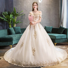 东莞市腾玛智能科技有限公司法蒂雅 新娘结婚主婚纱礼服2020新款香槟色一字双肩大码绑带长拖尾简约婚纱秋冬季女 香槟色绑带1.5米拖尾 XL
