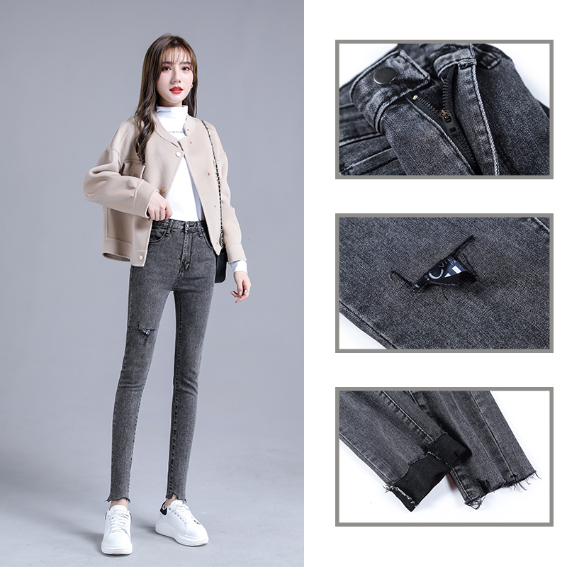 秋冬新款设计感破洞保暖弹力休闲紧身女士高腰长腿铅笔小脚牛仔裤