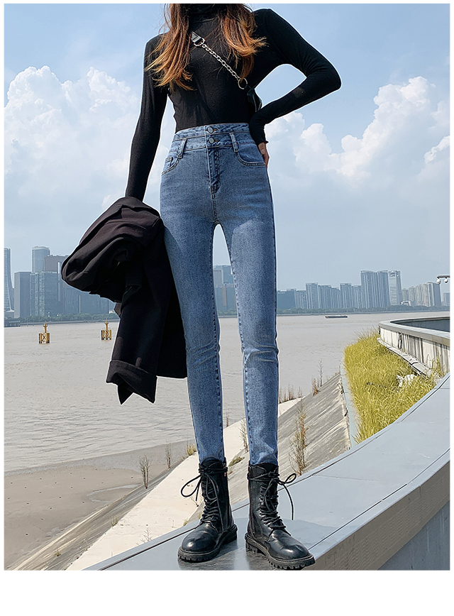 高腰双扣牛仔裤女收腰收腹显瘦显高秋季百搭款紧身九分铅笔小脚裤