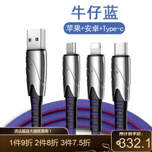 多功能闪充type-c三头二合一充电线 三合一【牛仔黑】1.2m