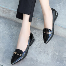 可欣百丽女鞋低跟单鞋女浅口粗跟鞋秋新款尖头漆皮女式休闲皮鞋大小码 黑色 36