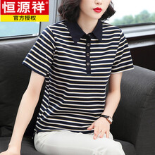恒源祥【特价捡漏】纯棉短袖T恤女夏装新款中老年妈妈翻领条纹大码半袖上衣polo 咖啡色 L