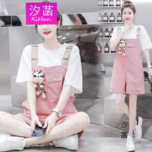 汐菡2021夏季新款学院风女生背带裤可爱型直筒裤高中生牛仔背背裤套装女夏天中学生女宽松吊带裤两件装2 蓝色套装 M