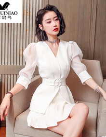 富贵鸟夏装2021新款女职业装气质女神范衣服套装女人味赫本风时尚连衣裙 白色-短袖 S