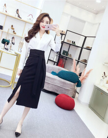 裙子2021韩版名媛气质长袖衬衣+高腰开叉半身裙 白衣黑裙 L