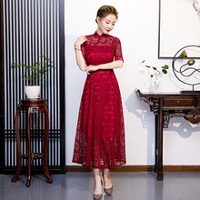 旗袍长款优雅复古冬季复古民族风蕾丝中袖妈妈款黑色旗袍裙新品 黑色 M