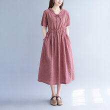 2021夏季新款气质棉麻连衣裙子日系小清新格子棉麻连衣裙女夏季新款大码文艺宽松中长款a字裙子 黑白格 XL 【建议125斤~140斤】