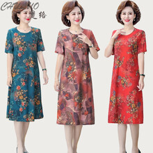 中老年女夏装冰丝连衣裙女弹力胖妈妈装短袖宽松显瘦碎花大码裙子 蓝色 4XL 140-155斤