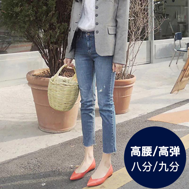 2018春秋新款韩版chic复古直筒高腰牛仔裤女九分微喇破洞显瘦八分 | |