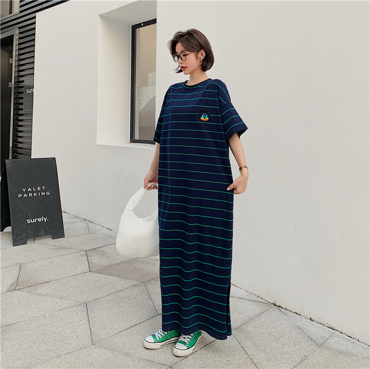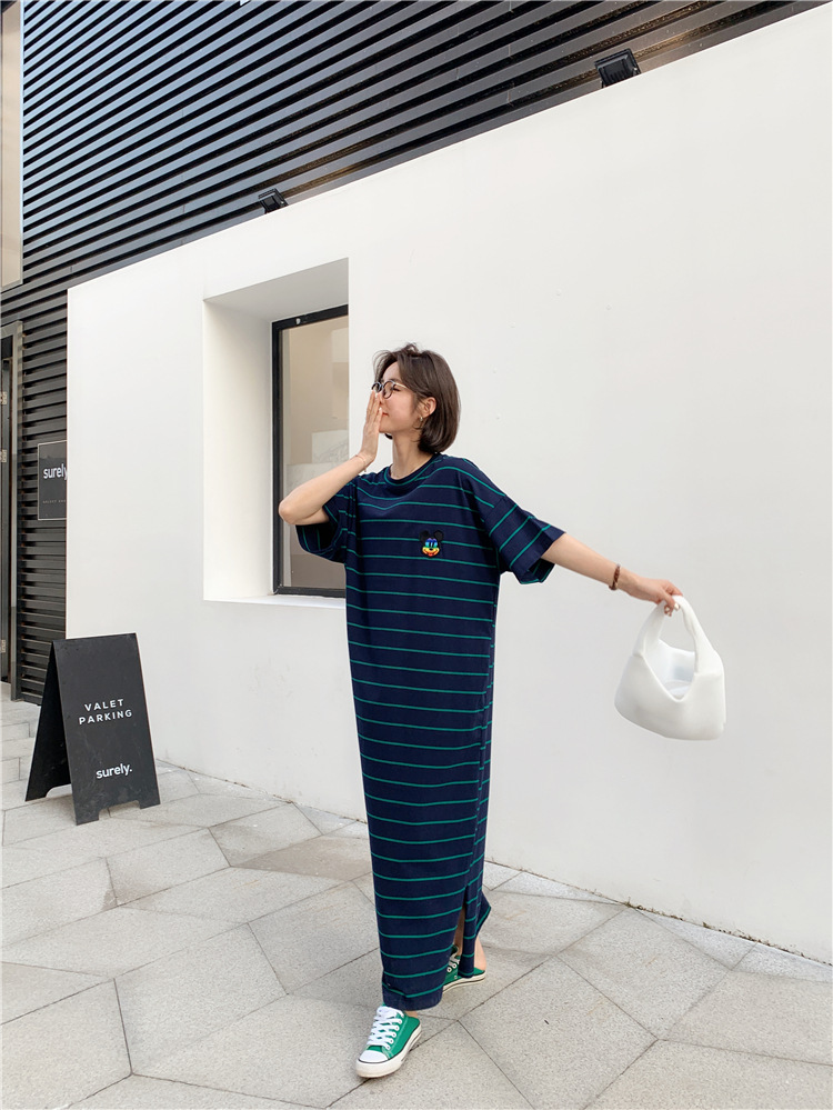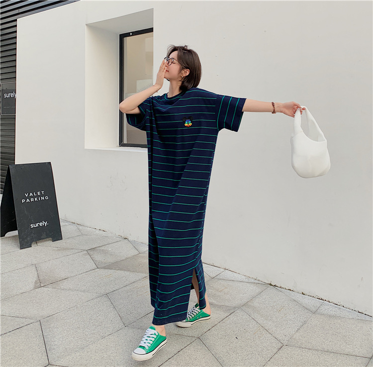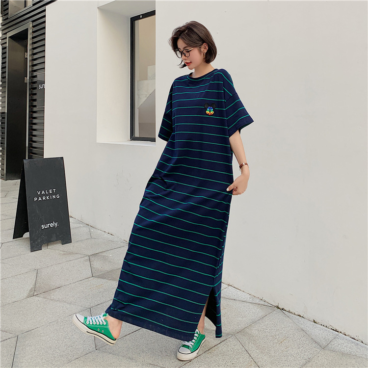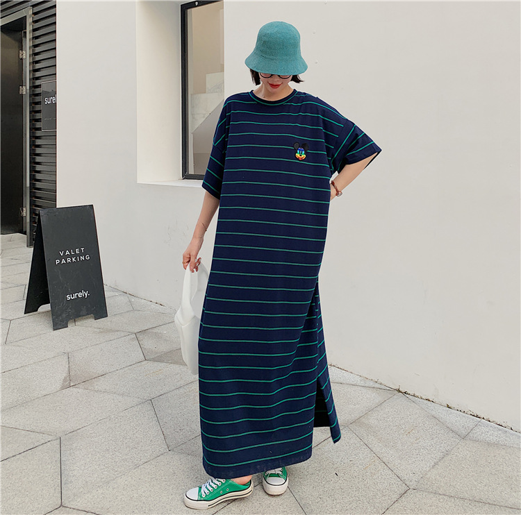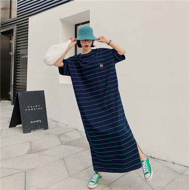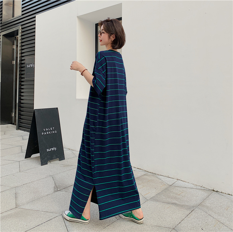 宽松显瘦大码长款过膝T恤裙潮女2022新款夏季开叉条纹短袖连衣裙