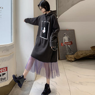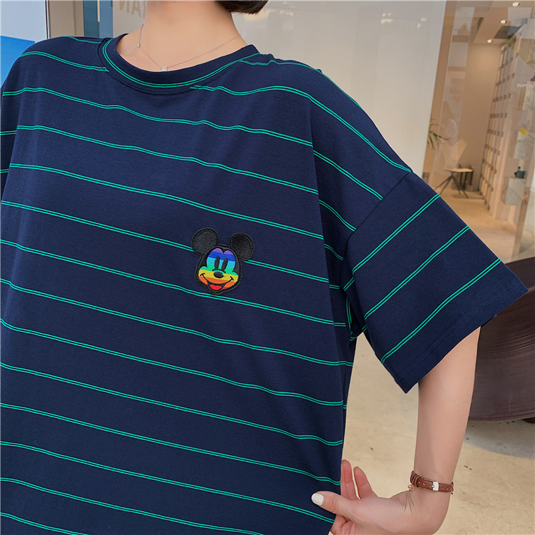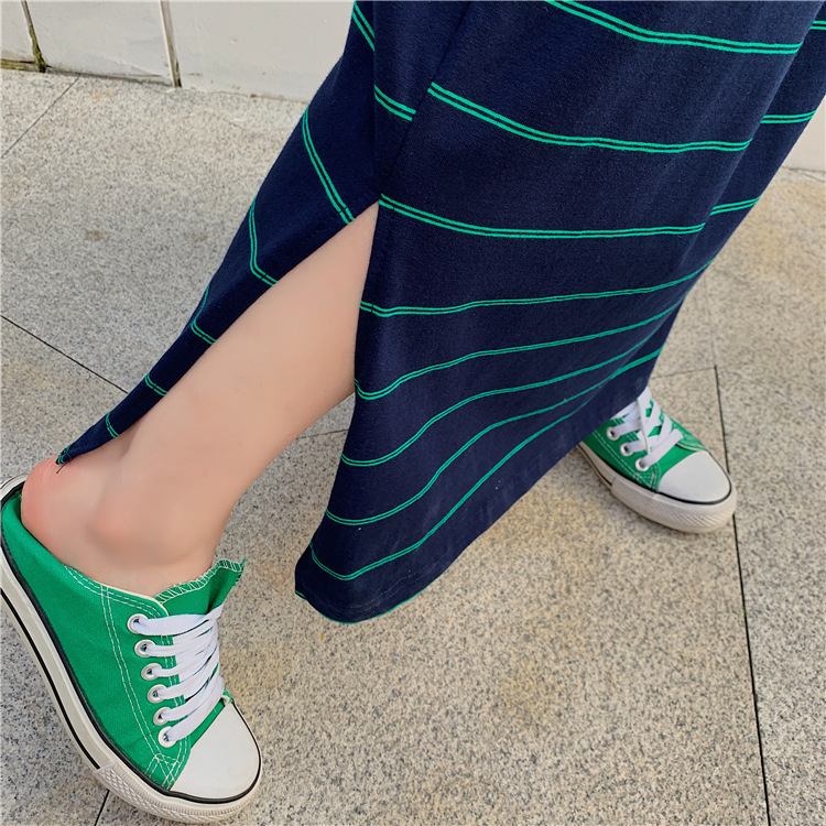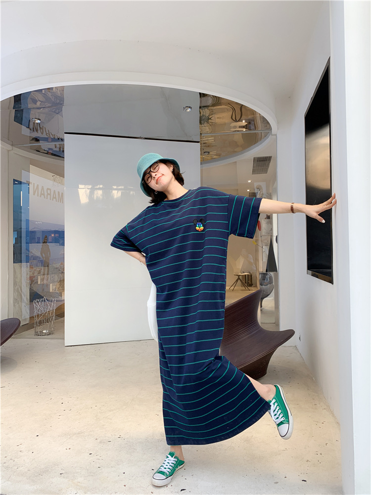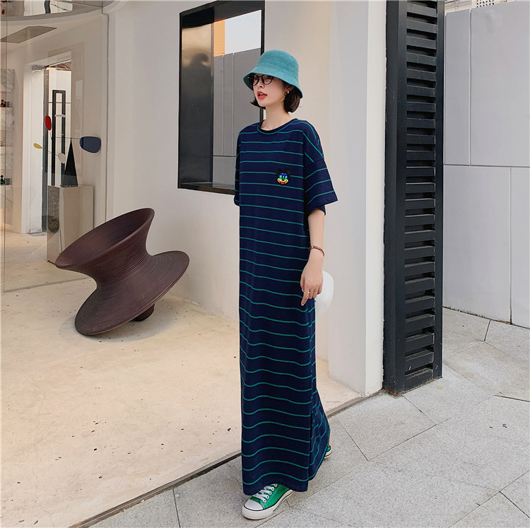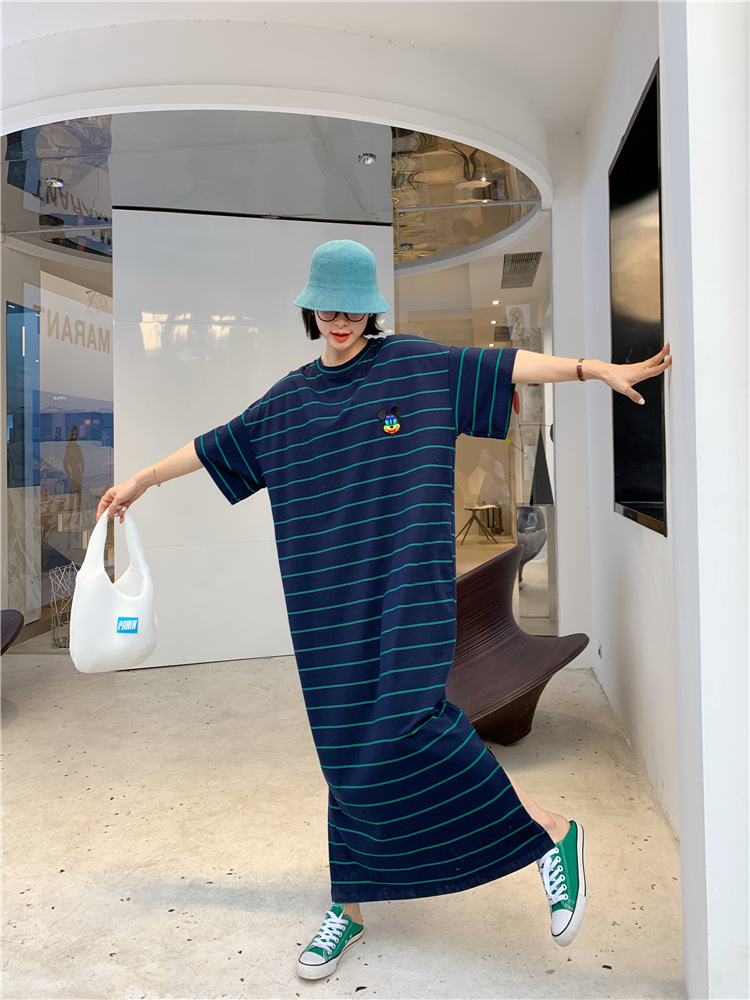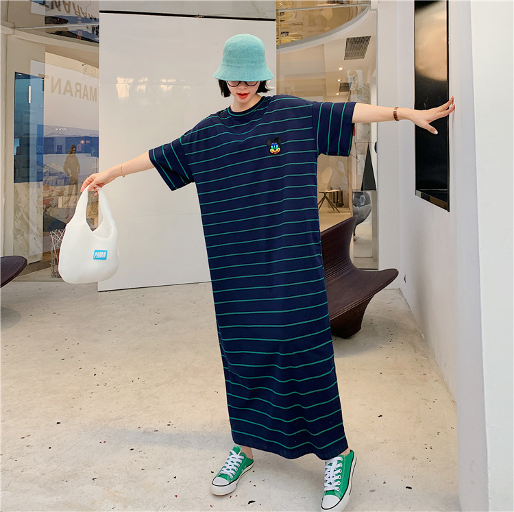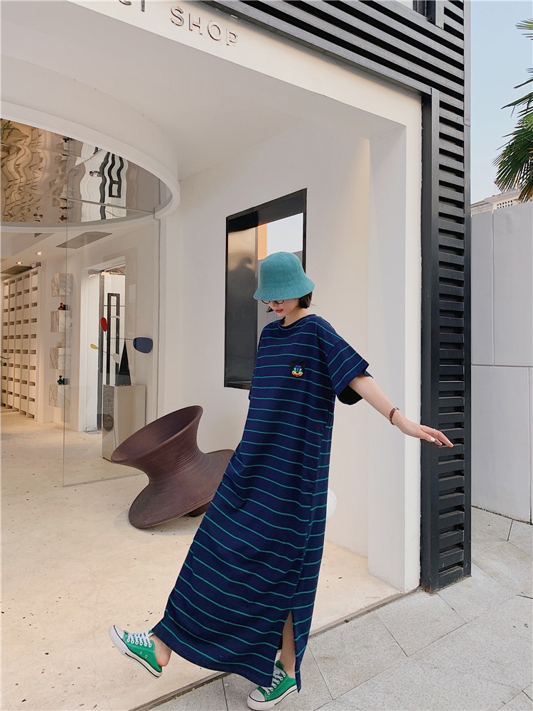 宽松显瘦大码长款过膝T恤裙潮女2022新款夏季开叉条纹短袖连衣裙
