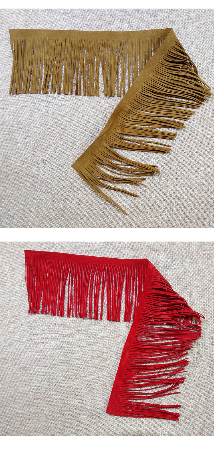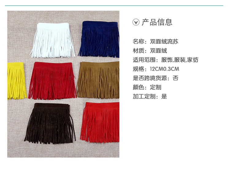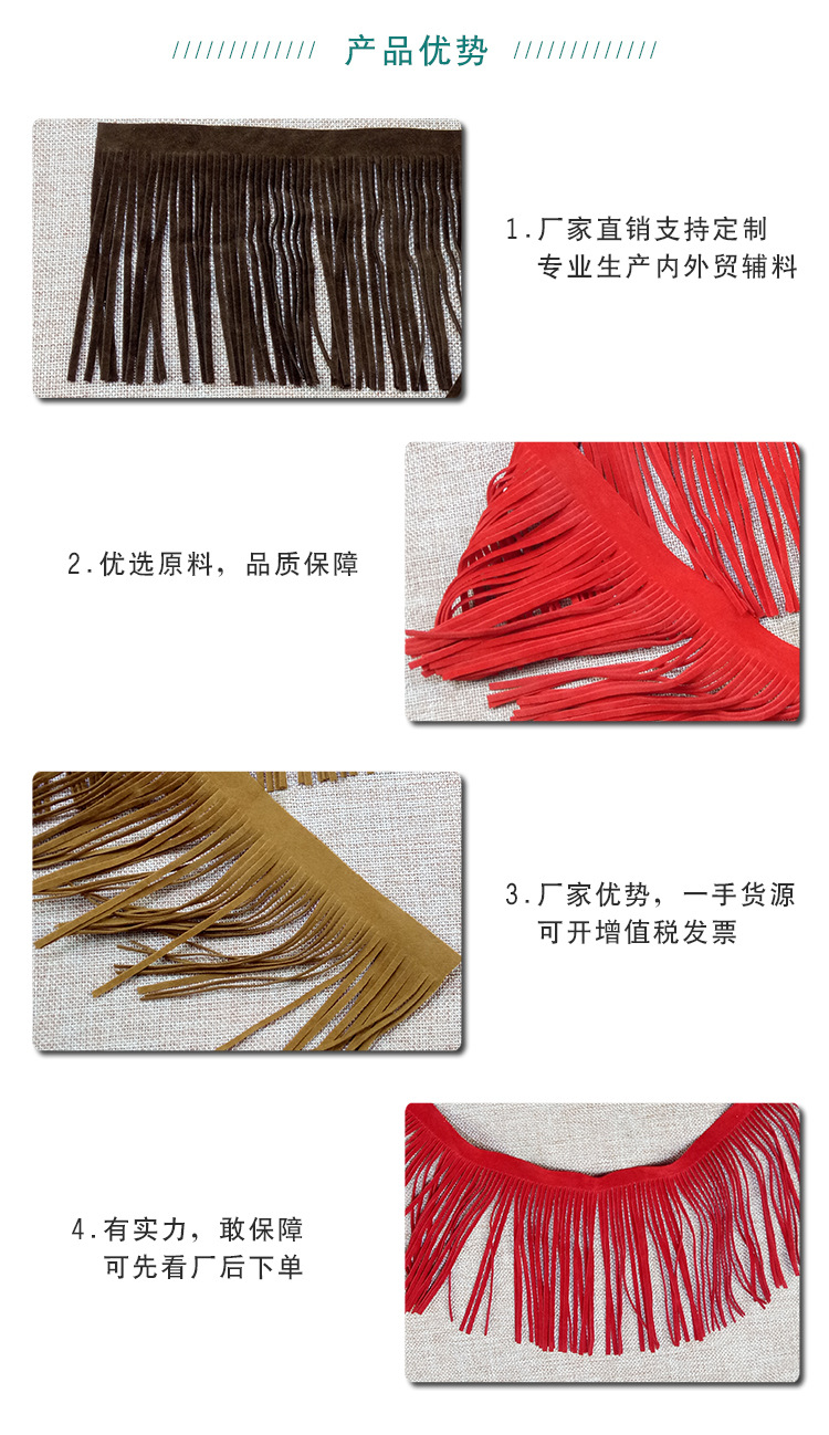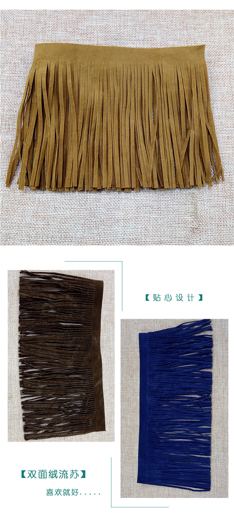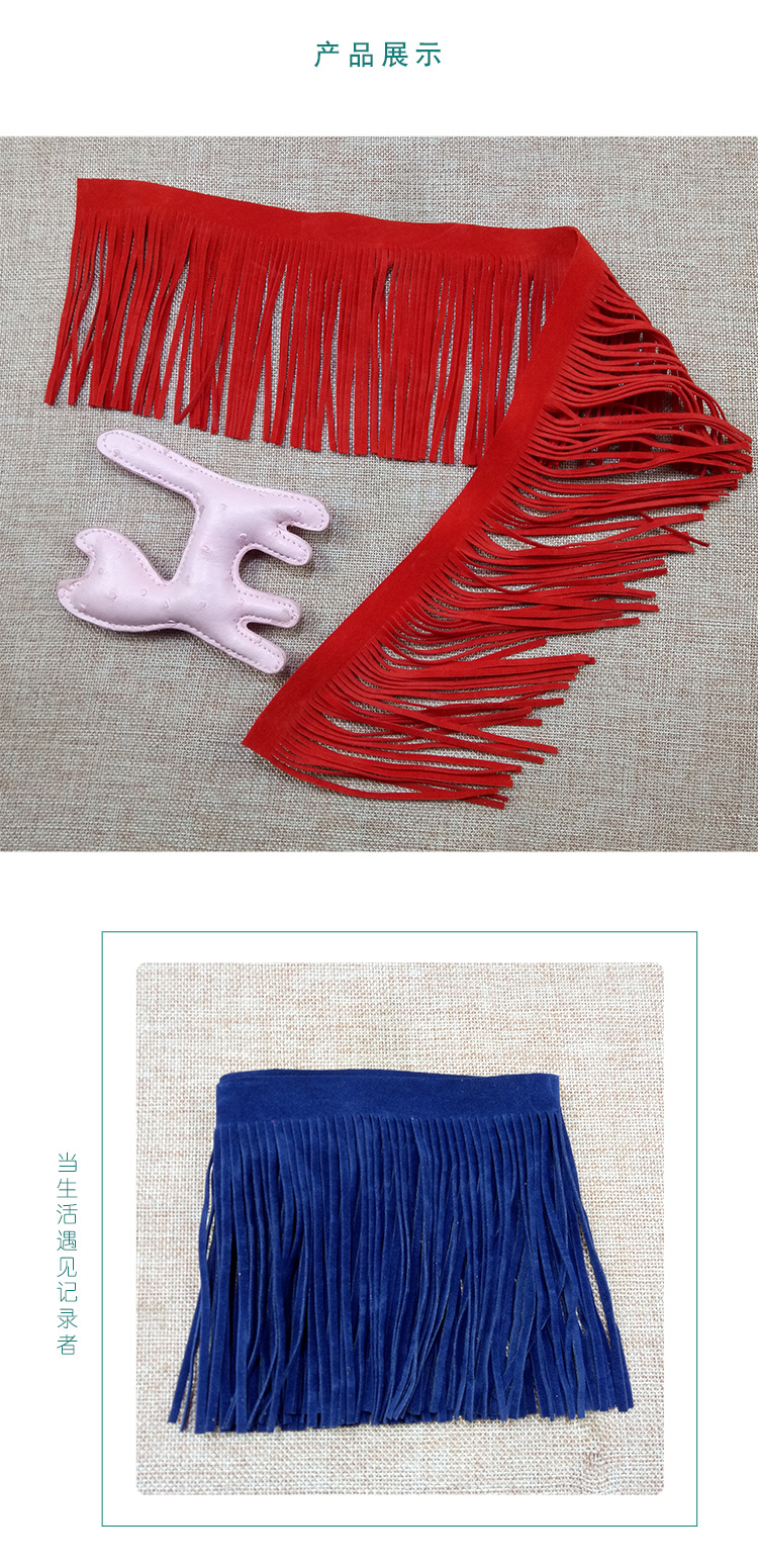材质鹿皮绒流苏,规格:流苏高度15CM宽度0.3CM、其他材质颜色尺寸可以按照客户要求定制,工厂支持打样确认做大货的,尺寸不一样价格不一样,流苏可以对外来加工的, 冷切流苏规格,小机械切宽度:1mm开始/长度;38cm以下都可以切/大机械切宽度:5mm开始/长度:94cm以下都可以切/ 材质:真皮/羊皮/牛绒/韩国绒/鸡皮绒/双面鹿绒单面鹿绒PU/仿皮.布料.毛料.其它等都可以来料加工包工包料切流苏