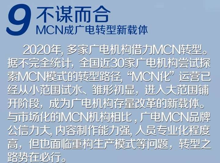 从CTR长期进行的数据监测也可以看到,截至去年底,21家广电机构自有媒体APP产品累计下载量出现了翻倍增长;15家广电媒体微信账号年度阅读量也实现翻番。另外,在体制机制改革方面,我们也看到2020年广电系MCN出现爆发式增长,我相信未来一两年还会继续出现蓬勃式的增长,也期待各家主流媒体在体制机制改革、全媒体人才培养这两个中央文件重点强调的方向上有更进一步推进。