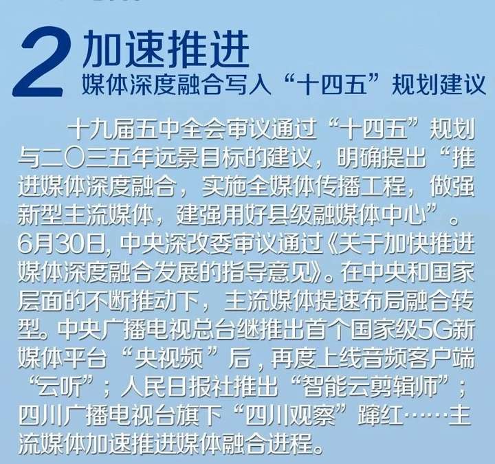 胡正荣:媒体深度融合写入十四五规划,我觉得有两个关键词:时间上要加快,空间上要加深。过去媒体融合也取得了很多成就,但是前五年的媒体融合的深化改革做得并不到位,比方说机制体制改革、资源配置方式改革。6.30文件在体制机制、全媒体人才这两个方面提出的要求非常具体,这无疑给媒体吹响了加快和纵深融合的号角。