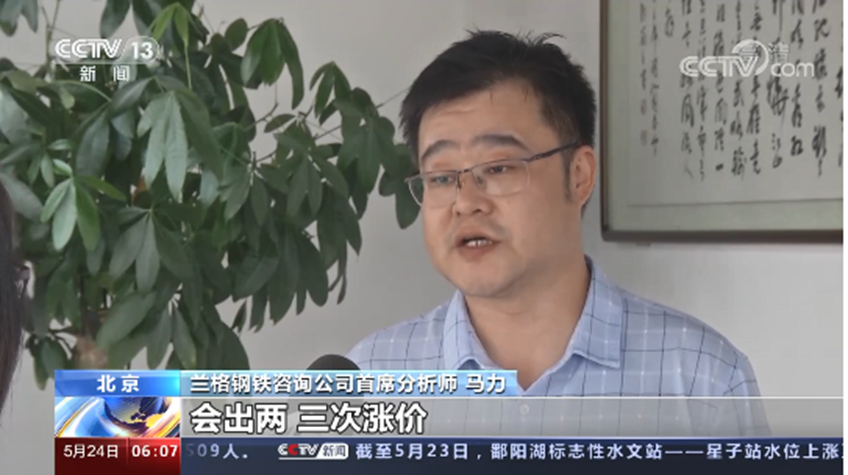 5月24日,中央电视台就钢价上涨原因、未来走势采访兰格钢铁网首席分析师马力和兰格钢铁研究中心主任王国清。