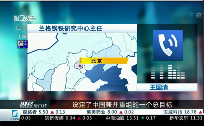上海第一财经电视台就钢铁行业并购重组采访兰格钢铁研究中心主任王国清。