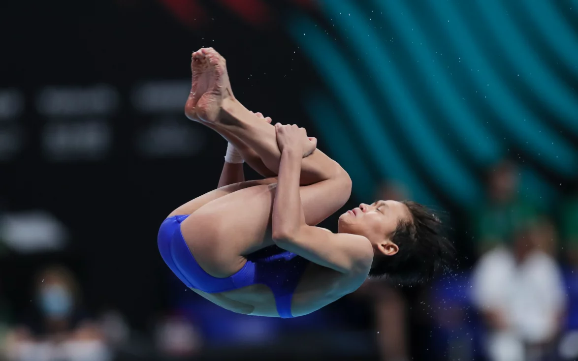 6月29日全红婵在比赛中,她和队友白钰鸣夺得混合全能金牌。 图/新华社