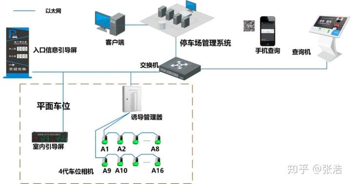 诱导部分包括数据采集模块(包括车位检测相机、车位引导灯等)、中央控制模块(包括诱导管理器、中心服务器等)、数据库服务器、信息发布模块(包括室内引导屏等)组成。
