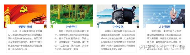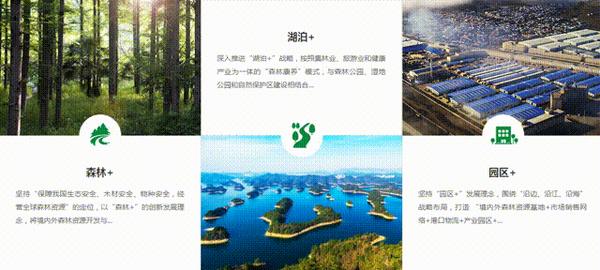 中国林业集团公司以做生态产业领袖、创世界一流企业为发展目标,以森林+、湖泊+、园区+三大战略划分为3个模块,配以专属业务图片,板块中间用logo区分文字图片,吸引用户点击,增加页面交互感。