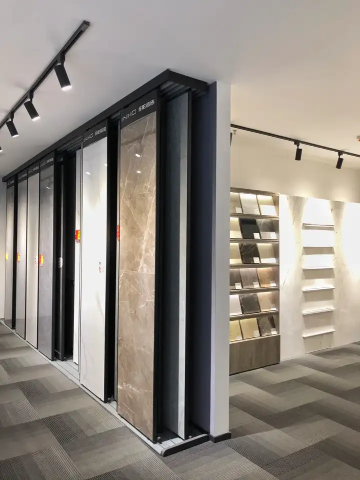 瓷砖展示区域也有脱胎换骨般的升级,整块瓷砖满墙展示,小方砖分门别类摆放,各种颜色、各种款式,方便大家实地感受。