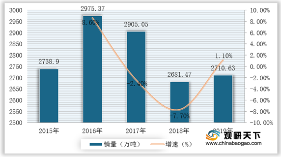 2015-2019年我国乳制品行业销量及增速