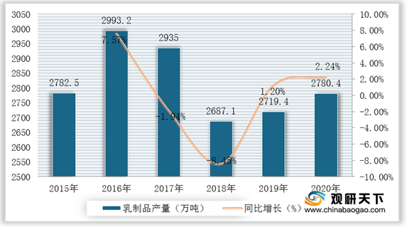 2015-2020年我国乳制品产量及增速