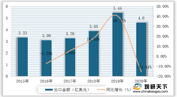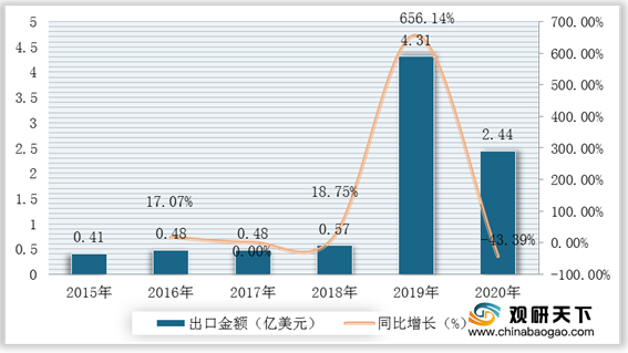 2015-2020年我国乳制品出口金额及增速