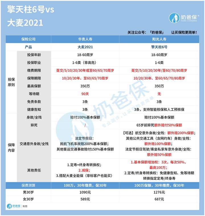 毕竟口说无凭,没有对比就没有性价比,接下来,奶爸就用网红定期寿险大麦2021与擎天柱6号进行对比,看看擎天柱6号到底如何?