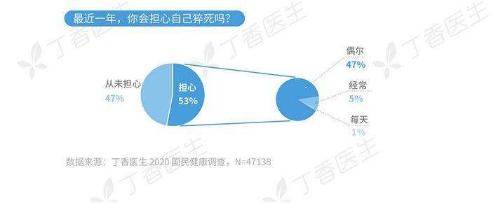 据丁香医生发布的《2020国民健康洞察报告》显示,大约53%的人会担心自己猝死,详情请看: