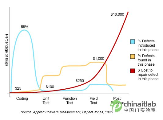 从图中,我们可以看出越后期修复缺陷的成本就越高,且指数增长,而缺陷主要是开发前期引入的,且前期缺陷修复成本很低,所以我们应该知道,测试越早越好。