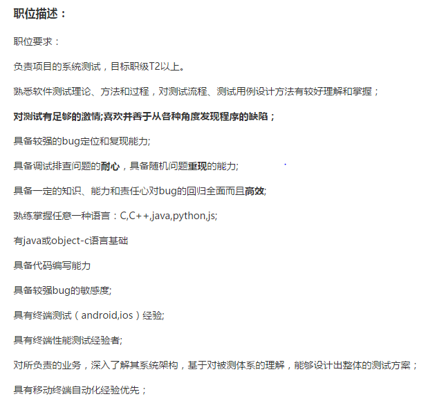 (3)应用在服务器性能的测试:目的是实现服务器设备、服务器操作系统、数据库系统、应用在服务器上性能的全面监控。性能测试目的是验证软件系统是否能够达到用户提出的性能指标,同时发现软件系统中存在的性能瓶颈,优化软件,最后起到优化系统的目的。补充说明:两个插件YSlow、page speed,静态评估网页性能的插件,可以评估网页性能并获得有关如何改进性能的建议,有兴趣的产品经理可以了解,后期优化产品时可以有底气地和开发人员沟通。当然也有APM(应用性能管理)对企业系统即时监控以实现对应用程序性能管理和故障管理的系统化的解决方案,比如听云官网。软件经过上述主要的测试后提交bug修改bug后,需要再次测试检验软件是否能正常运行,也就是所谓的回归测试。回归测试:修改了旧代码后,重新进行测试以确认修改没有引入新的错误或导致其他代码产生错误。在整个软件测试过程中占有很大的工作量比重,软件开发的各个阶段都会进行多次回归测试,且尽量实现自动化,作为自动化测试的优先级。测试重心在关键模块和重点功能模块上。产品经理测试验收产品时,主要是采用手工测试以用户视角来测试产品,根据用户需求,采用事件驱动,输入和输出,测试软件系统的界面和功能,主要测试方向为功能、可用性、用户体验,所以主要是进行系统测试的功能测试、界面测试、可靠性测试、易用性测试、兼容性测试。而性能测试、安全测试等自动化测试由专门的测试人员实施。另外,应该知道测试原则的几个主要特点:软件测试不能保证百分百没有缺陷,缺陷具有群集特性(即缺陷主要出现在有缺陷的模块,重点关注),测试的二八原则(80%时间用在20%的重点模块上,提升效率和资源使用率),测试活动依赖测试背景(依赖软件的应用背景,比如银行金融软件,侧重安全,所以更偏向于安全性测试)。补充说明:目前互联网公司大多强调敏捷开发,所以我们讲讲敏捷开发及敏捷测试的知识。敏捷开发:以用户的需求进化为核心,采用迭代、循序渐进的方法进行软件开发。也就是需求一直在变更,我们需要拥抱变更。主张的价值观:沟通、简单、反馈、勇气、谦逊。敏捷宣言:个体和交互 胜过 过程和工具;可以工作的软件 胜过 面面俱到的文档;客户合作 胜过 合同谈判;响应变化 胜过 遵循计划。每项对比中,虽然后者也有价值,但我们认为前者更有价值。敏捷测试是遵循敏捷宣言的一种测试实践:(1)强调从客户的角度,即从使用系统的用户角度,来测试系统。(2)重点关注持续迭代地测试新开发的功能,而不再强调传统测试过程中严格的测试阶段。(3)建议尽早开始测试,一旦系统某个层面可测,比如提供了模块功能,就要开始模块层面的单元测试,同时随着测试深入,持续进行回归测试保证之前测试过内容的正确性。(4)强调持续反馈,预防缺陷胜过发现缺陷。敏捷开发的好处:开发和测试人员是紧密合作,大家都有责任对软件负责,所以产品更能符合需求文档的要求。核心系统集成和高频集成是敏捷开发的比较常用的测试方法。6、产品经理如何测试验收产品讲完测试概念,就应该到实践了,即如何测试验收产品。产品经理测试一个产品,不能用产品思维去测试一个产品,因为产品经理是最熟悉产品的人,产品每一功能每一个步都知道操作流程,所以往往只能发现一些不符合产品需求功能上的bug,而会忽略真实用户去使用的问题,比如某个功能点的使用路径过深,导致用户找不到,用户产生挫败感。所以产品经理测试验收产品,除了验收是否符合产品需求外,还需要发现产品的可用性、可行性、情感化设计的用户体验问题。因此,测试产品过程中,产品经理需要跳出产品思维,转为用户思维,甚至转为测试人员的思维,更广度和深度的测试验收。那么如何转为测试人员的思维呢?首先需要了解测试人员的职责及工作,这样才能更好地了解到测试人员使用到的测试思维,才能更好地转为测试人员的思维。下面来看看拉勾的腾讯的测试工程师的招聘的职位要求,如下图所示: