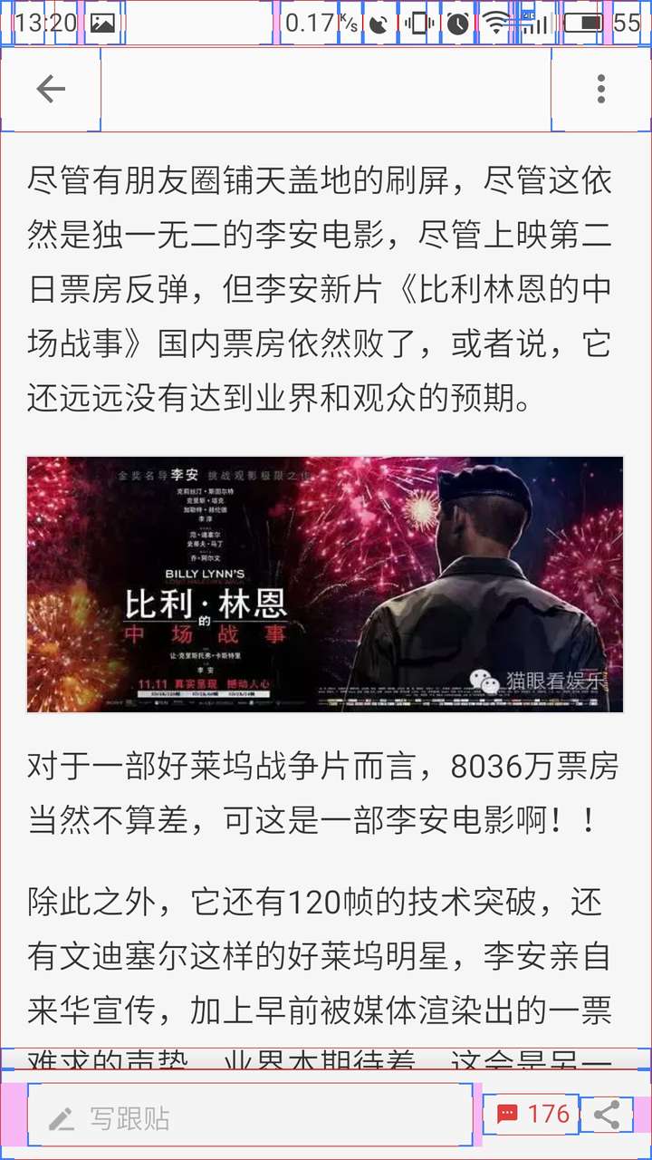 以android为例,首先打开显示布局边界,在开发者选项里可以找到显示布局边界,打开。然后再打开网易新闻,如下图,你会看到界面布满各种边界,每个边界都是一个控件,控件可以包括控件,所以你会看到大边界包括小边界,如下图。当然有些为了使用流畅度,会采用webview控件,就相当于调用一个网页显示内容的控件,但是也影响使用用户体验,内容加载慢,目前利用cache缓存技术提供离线功能,预加载。新闻内容详情主体的大边界就是一个webview,如下图所示:
