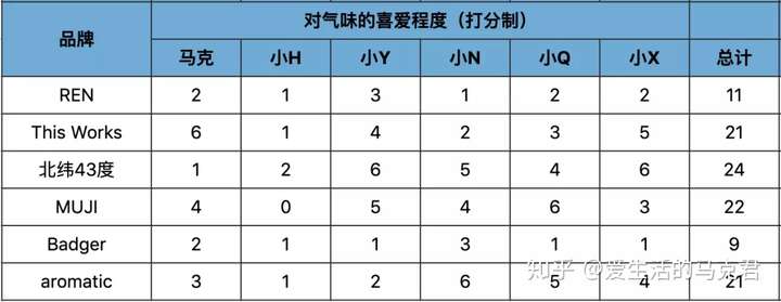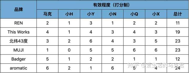 像aromatic和MUJI都有最高分和最低分同时出现的情况,北纬43度和This Works的表现相对来说比较平均,当然REN和Badger的分数也低得很均衡。