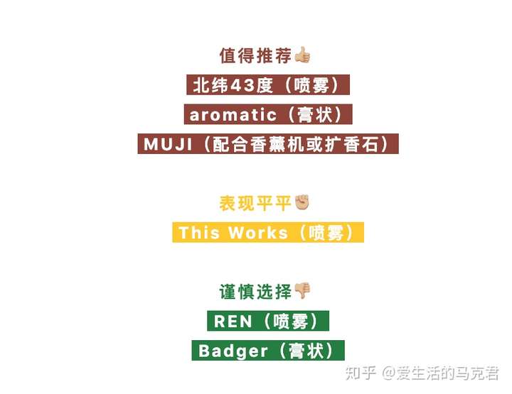 3款喷雾中最推荐北纬43度,香气宜人,不会太挑;aromatic小小一个只要十几块钱,性价比很高,出门旅游携带也很方便;MUJI更适合在家使用,营造被薰衣草包围的感觉只需要几滴精油。