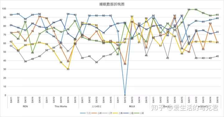 每个人每个产品使用一周,耗时一个半月。主要是用蜗牛睡眠来监测睡眠质量,当然蜗牛睡眠作为一个行为检测仪,数据只能作为一个参考,不太准确,毕竟有小伙伴三点还没睡着还能拿95分...