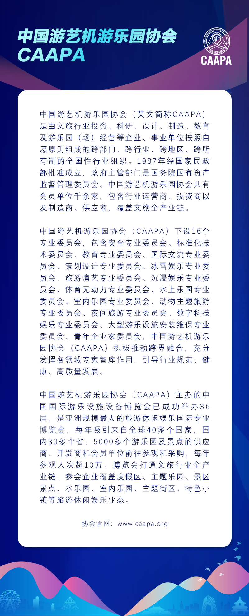 这里是中国游艺机游乐园协会(CAAPA)定期更新的会员资讯,如果您是CAAPA会员,欢迎您将企业资讯发送至CAAPA宣传部进行投稿。