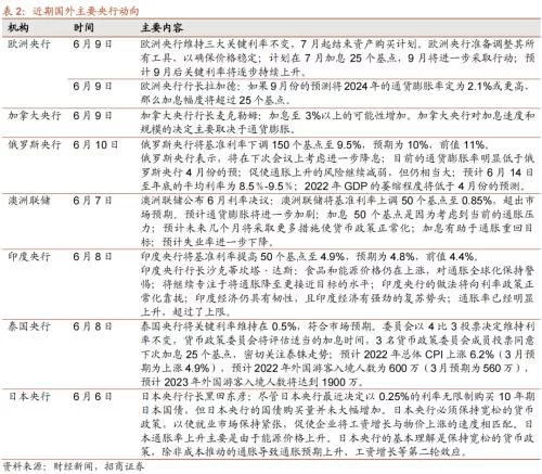 欧洲央行维持三大关键利率不变,7月起结束资产购买计划,计划在7月加息25个基点,9月将进一步采取行动,预计9月后关键利率将逐步持续上升。欧洲央行行长拉加德表示如果9月份的预测将2024年的通货膨胀率定为2.1%或更高,那么加息幅度将超过25个基点。俄罗斯央行将基准利率下调150个基点至9.5%,预期为10%,前值11%。俄罗斯央行表示,将在下次会议上考虑进一步降息。