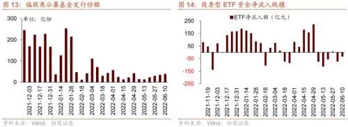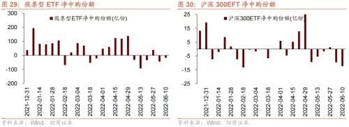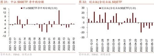 6月6日-6月10日,ETF净赎回,当周净赎回17.3亿份,宽指ETF以净赎回为主,其中沪深300ETF赎回最多;行业ETF申赎参半,其中信息技术ETF申购较多,新能源&;智能汽车ETF赎回较多。具体的,沪深300ETF净赎回12.3亿份;创业板ETF净赎回6.1亿份;中证500ETF净申购0.5亿份;上证50ETF净赎回2.2亿份。双创50ETF净赎回6.3亿份。行业方面,信息技术ETF净申购12.2亿份;消费ETF净申购0.5亿份;医药ETF净赎回1.9亿份;券商ETF净赎回9.0亿份;金融地产ETF净申购1.8亿份;军工ETF净申购2.5亿份;原材料ETF净申购0.2亿份;新能源&;智能汽车ETF净赎回14.5亿份。